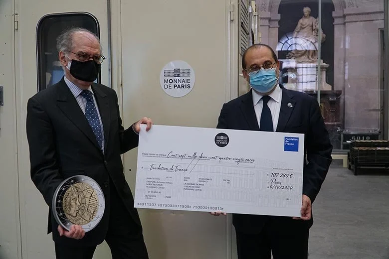 Aujourd’hui, la Monnaie de Paris souhaite poursuivre son engagement en faveur de la Fondation de France : « Cette année, compte-tenu de la situation sanitaire mondiale, il nous a paru indispensable, dans la continuité de nos actions avec la médaille « Merci », de créer une pièce de collection de 2 euros au profit de la recherche médicale », a déclaré son président-directeur Marc Schwartz. Le rendez-vous du 6 octobre à la Monnaie de Paris a ainsi été l’occasion pour Pierre Sellal, président de la Fondation de France, d’inaugurer la première frappe de cette monnaie de collection.
